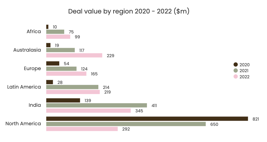 Deal value by region 2020 to 2022