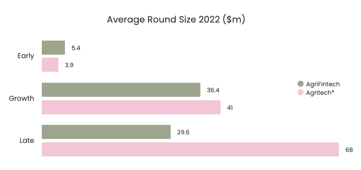 I also compared average round sizes for example. Below, I've charted the data using the Agfunder report on AgriFoodtech for that particular sector and found some disparities. (FWIW, I'm not overly concerned by the apparent late stage lag below and you'll understand why when you dive in). I've done the same for Fintech and outlined the top 3 deals in each sector and how the overall numbers compare. Have a look.